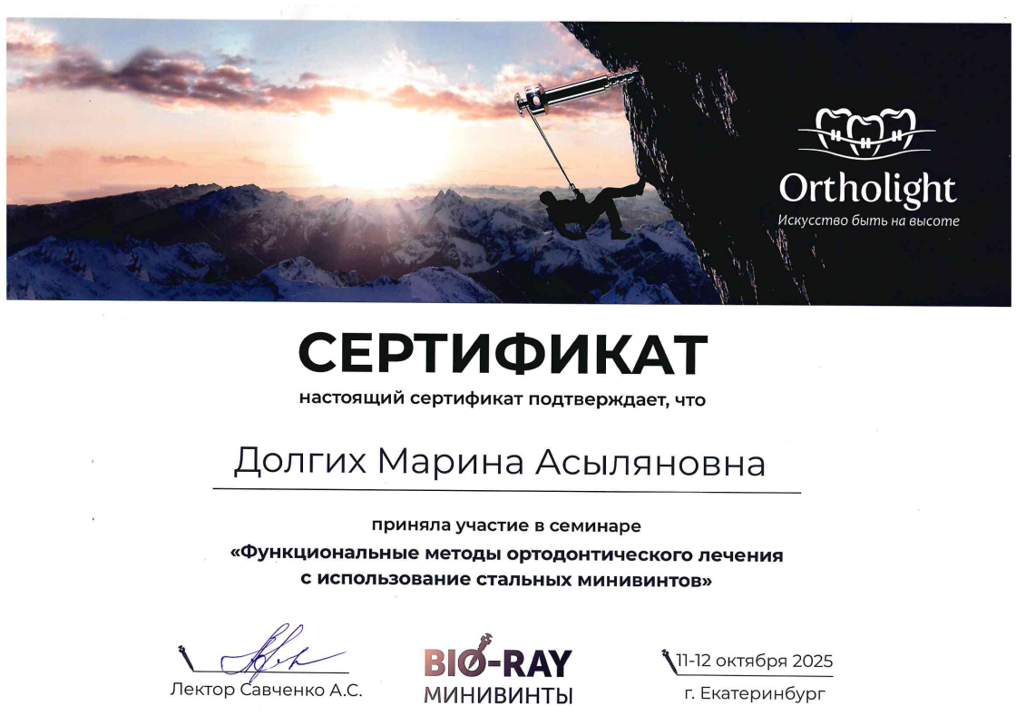 Марина Асыляновна Долгих подходит к любому виду ортодонтического лечения комплексно, не только исправляя прикус или положение зубов, но и делая акцент на их взаимосвязи в функционировании других важных систем организма.